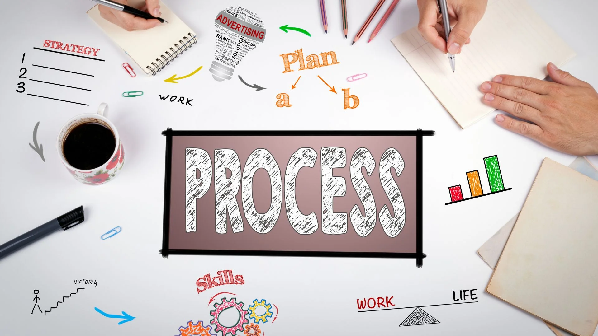 Une main avec un marqueur écrit sur un écran transparent affichant diverses icônes