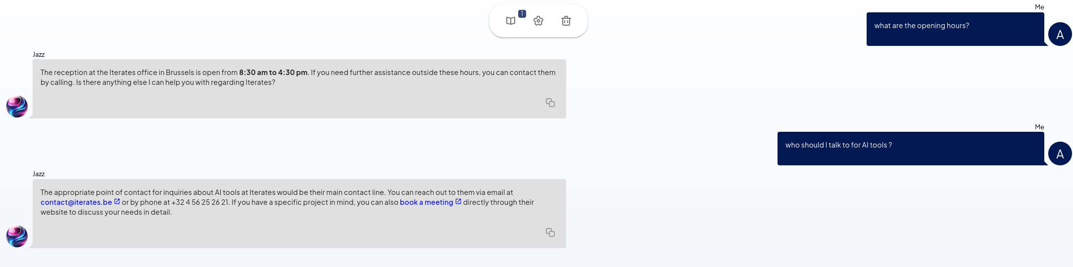 Vous pouvez utiliser un outil comme JAZZ AI pour créer votre propre ChatBot interne. Les employés pourront recevoir des réponses à leurs questions sur l’entreprise, les équipes, les personnes dans l’entreprise, le processus, et bien plus encore.